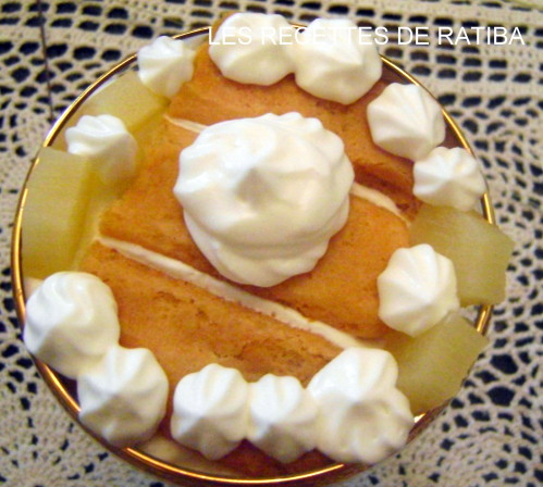 d’ananas couper et remettre une cuillère de crème et prendre 2 biscuits à la cuillère et les badigeonner dans le jus et les mettre sur la crème et décorer sellon le gout et mettre aussi tot au